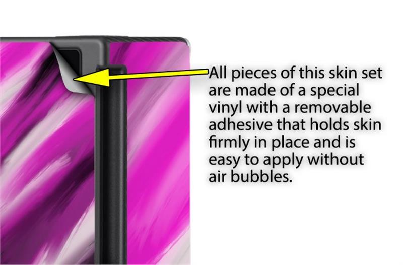 WraptoSkinz™ skins are superb photo quality designs and vibrant colors printed with special Eco-Friendly, fade resistant inks. Our skins are self-adhering flexible vinyl skins that helps prevent scratches. Made of composite, multi-layered commercial grade materials. The bottom layer is made with a special removable adhesive that is easily positioned and applied without air bubbles. We print your design on the bottom layer then bond a professional grade laminate over the entire skin adding a glossy protective finish.