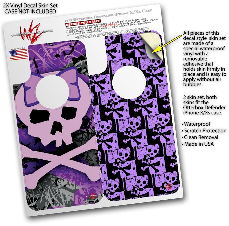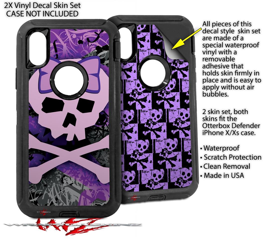 2x Decal style Skin Wrap Set compatible with Otterbox Defender iPhone X and Xs Case - Purple Girly Skull (CASE NOT INCLUDED)