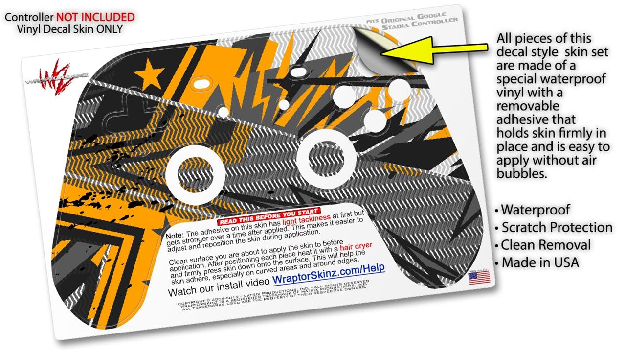 This product is in no way affiliated with or endorsed by Google. WraptorSkinz® skin wraps work with the Original Google Stadia version 1 Controller. Printed using superb photo quality designs and vibrant colors printed with special fade resistant inks that last even in direct sun for years. WraptorSkinz are a composite of two layers of commercial grade materials. The bottom layer is a soft, flexible vinyl with a special removable adhesive that is easily positioned, applied without air bubbles. Next, we print the bottom layer with UV protected, fade resistant inks that deliver superb photo quality designs in vibrant colors. Finally, we bond a professional grade laminate over the entire skin adding a glossy protective finish.