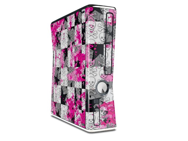 Checker Skull Splatter Pink Decal Style Skin for XBOX 360 Slim Vertical