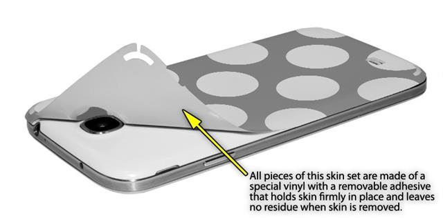 • Decal style vinyl skin covers front and back of Samsung Galaxy S4 phone.