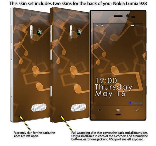 • Decal style vinyl skin covers front, back and side of Nokia Lumia 928 phone.